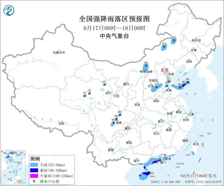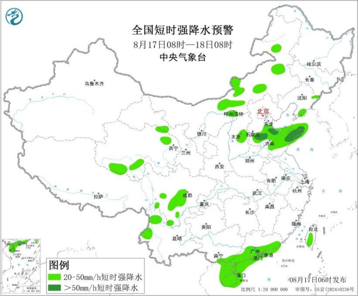 预计8月17日08时至18日08时,内蒙古中东部、西北地区中部、华北中南部、黄淮北部、西南地区北部、华南南部等地的部分地区将有8级以上雷暴大风或冰雹天气,其中,内蒙古中部、山东中东部等地的部分地区将有10级以上雷暴大风;内蒙古中部和东部、西北地区中部、华北中南部、黄淮北部、西南地区北部、华南南部等地的部分地区将有小时雨量大于20毫米的短时强降水天气,其中,河北南部、山东北部和东部等地的部分地区小时雨量大于50毫米,最大可达70毫米以上。