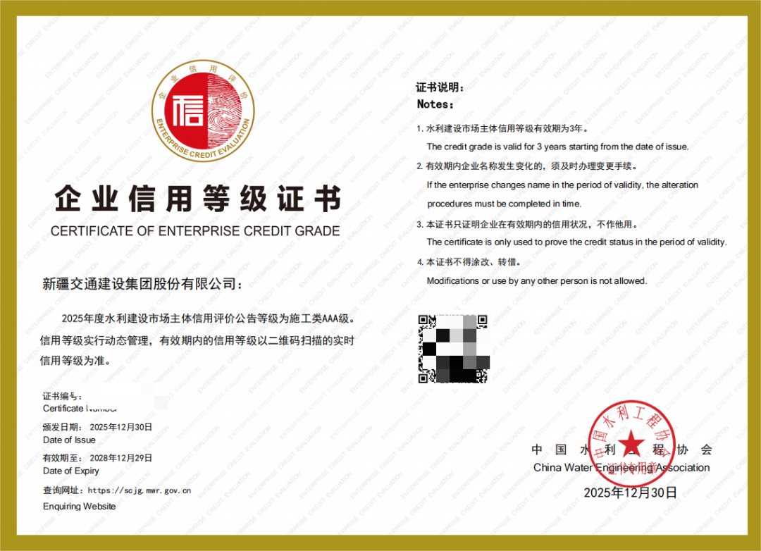 近日,新疆交通建设集团股份有限公司凭借扎实的综合实力、规范的经营管理、优良的市场信誉及卓越的履约表现,成功获评2025年度水利建设市场主体信用AAA级评价,该证书是水利建设行业信用评价的最高级别。此次成功获评,标志着行业对交建股份(603815)长期以来坚守诚信经营理念、深耕水利建设领域的认可,更彰显了交建股份在水利工程施工、项目管理、风险防控等方面的过硬实力。